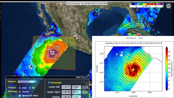 The RapidScat portal allows users to select a subset of data by using a rectangular subsetting tool. The portal will generate a wind map with the data in the selected area and put together a tarball of the original data for users to download. The subsetting tool works with either the RapidScat or the ASCAT wind products.