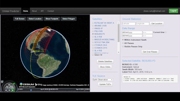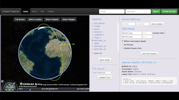 Cesium is used to visualize the orbits of the satellites and their instruments’ footprints. The satellites’ orbits are generated from the satellites’ two-line element sets and are are encoded in the CZML file format, using Christian Ledermann’s Python CZML library. The Cesium API is also used to calculate when the instrument footprint of the satellite intersects with the area of interest, and to specify the area of the earth that the user wants to observe.