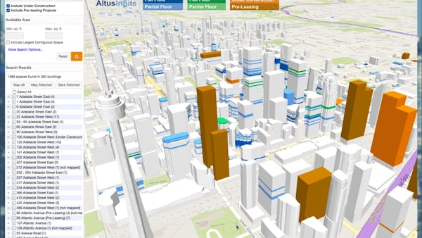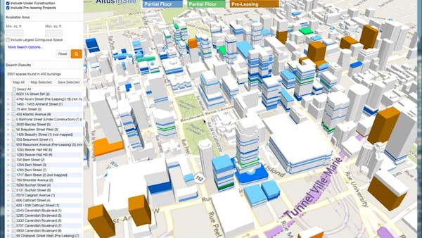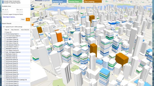 Created for Altus InSite, Canada’s largest commercial real estate data company, Cube Cities has developed a Cesium app that allows users to search for available office space in Canada’s five largest cities. The app uses the Oracle APEX framework as an interface for Cesium’s 3D map. Using a massive database of floor-level coordinates collected by Cube Cities, the app is able to specifically highlight a variety of office space options based on a user’s search criteria. Originally developed with the Google Earth API, Cube Cities has migrated all of the necessary logic and functionality to Cesium. Learn more about Cube Cities and visit our blog to find more examples of our work.