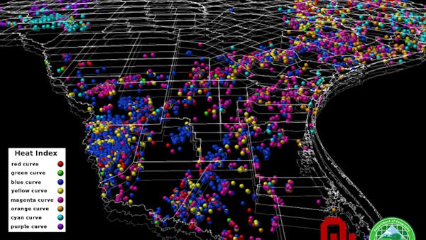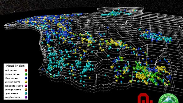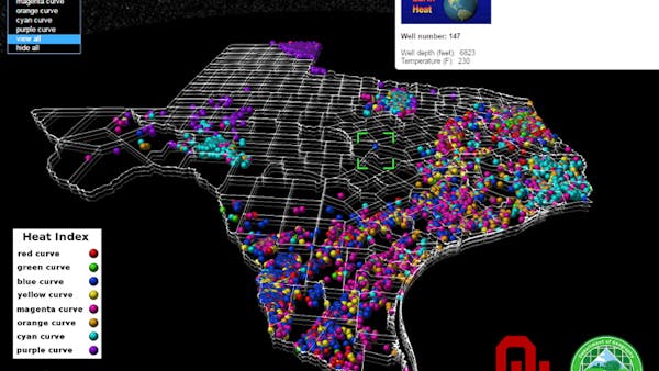 Texas Geothermal Subsurface Visualization represents heat indexes below the Earth’s surface. This data was derived from approximately 30,000 wells across Texas. Each color is based on a temperature curve. The benefit of using Cesium is that it allows for smooth subsurface viewing and interacting with geospatial scientific data sets.
