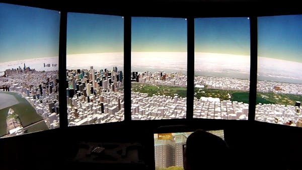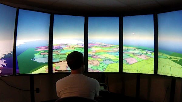 End Point displays Cesium on Liquid Galaxy. Originally created at Google, the Liquid Galaxy is a multi-screen, immersive, panoramic presentation platform that allows viewers to literally be surrounded by and immersed in data visualizations. The Liquid Galaxy platform allows the ability to adjust the viewing angle on each screen to match the physical offset, without any distortion issues. It is used around the world in corporate offices, museums, commercial enterprises, and at tradeshows and other events. Liquid Galaxy is used in industries as diverse as real estate, hospitality, travel, research, and education. Until we integrated with Cesium, Liquid Galaxy had run entirely on Google Earth.
