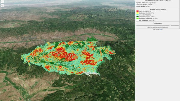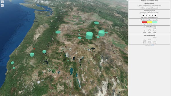 - History of Wildfire Severity: Animation of wildfire events since 1984, with drilldown to individual fires and color-coded severity assessments.