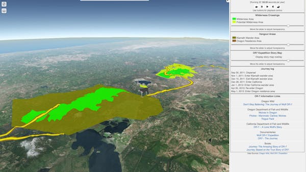 - The Journey of Wolf OR-7: Visualization and time animation of the migration route taken by the famous OR-7 wolf from northeastern Oregon all the way to California and back to Oregon’s Crater Lake area.