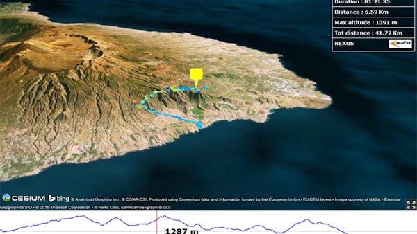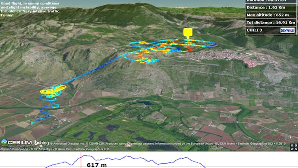 With the 3D viewer, pilots can analyze each flight in great detail. For every moment of the flight, the Paragliding Logbook displays altitude, ground speed, vertical speed, and efficiency. When mapped over Cesium’s globe, pilots can view their flight tracks above terrain in 3 dimensions, from every point of view, rotated, and zoomed. In addition, the tracks are colored according to the instantaneous vertical speed value, tending to red if the paraglider was climbing and tending to blue if descending. Flights can be visualized on both desktop and mobile devices.