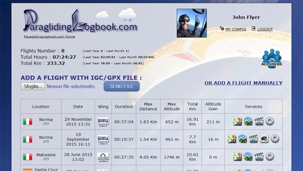 The Paragliding Logbook is a web app that allows paraglider pilots to keep a simple, ordered diary of their flights and share it with friends. For each flight track, the pilot can add notes, videos, and pictures. Users can also see the flight in a detailed 3D environment. Flights can be uploaded online automatically by the IGC files (typical of flight instruments) or via GPX files created with any standard gps logger. For those pilots who don’t have a flight recording instrument, it is also possible to manually enter a flight record.