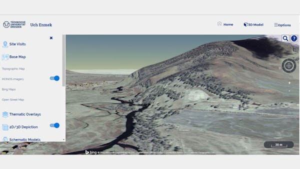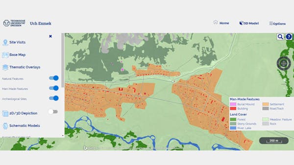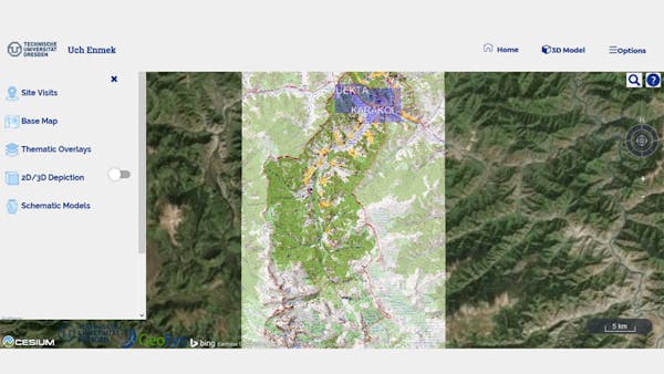 The Uch Enmek web application contributes to awareness, information, and appreciation of Uch Enmek. It comprises maps, satellite imagery, and model structures that have been created, interpreted, and compiled over many years of geo-scientific activities of the Institute of Cartography in the Altai. The archaeological inventory data shown in the overview map was contributed by archaeologists J. Bourgeois and his team of Ghent University.