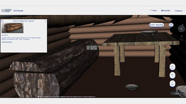 The “Options” switch allows zooming into higher detail, currently offered for the Tuekta and the Karakol sites. For the base map, users can choose imagery provided by Bing or by the Ikonos sensor, as well as OpenStreet Map data to provide context. More specific GIS layers can be draped over the selected base. Moreover, by choosing “3D depiction,” users can view the Tuekta and the Karakol sites in 3D mode using customized 3D terrain sources. Users can also use the “Schematic Model” controls to explore a 3D model of the kurgan underground burial chamber. The 3D glTF features and nodes, including houses, furniture, and tombs, are linked to a database where the associated descriptive information is stored.