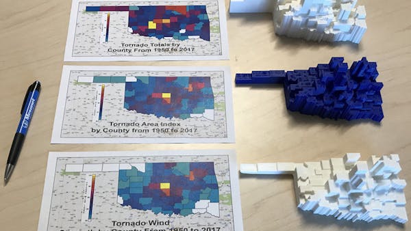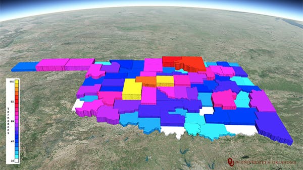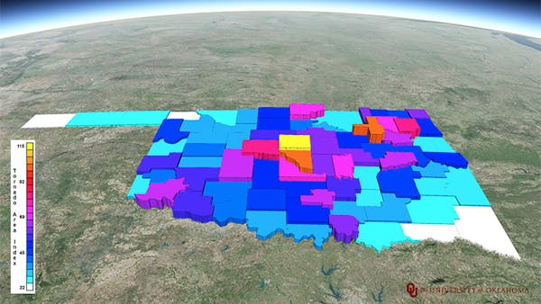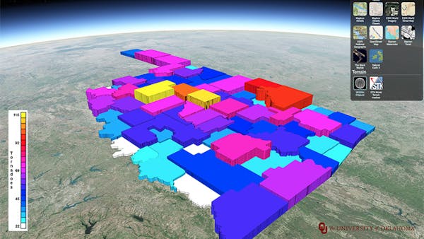 Oklahoma Tornado Totals by County Visualization represents three separate datasets dating from 1950 to 2017. The first dataset is tornado totals by county. The second dataset is an “Area Index” to better represent smaller and bigger counties by factoring in square miles. The third and last dataset takes into account wind speed to create a “Wind Index” that better represents the destructive power of each tornado. The benefit of using Cesium is that it allows for smooth representation and switching between the three datasets for viewing and interacting with geospatial temporal data. Part of this visualization includes a link to the KMZ files used in Cesium and STL files for 3D printing of the three datasets.