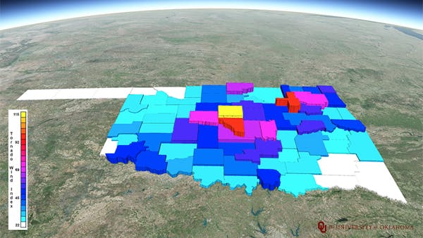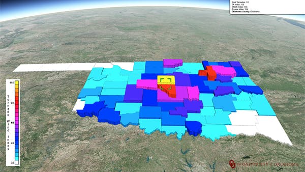 Researchers Reuben Reyes and Dr. Lesya Borowska of the University of Oklahoma are using Cesium to visualize Oklahoma tornado counts by county from 1950 to 2017. The initial work started by taking tornado county totals from the National Weather Service and converting the data to KML and KMZ files. This dataset was imported into Cesium and put on the web for interactive viewing. The live demo is available to anyone with a web browser.