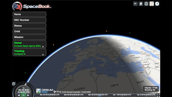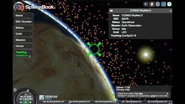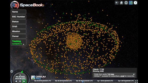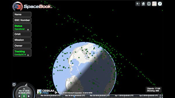 The visualizations of the ComSpOC are built on Cesium and the Systems Tool Kit (STK) Component Libraries. SpaceBook makes it possible for users to interact with the SSA data from ComSpOC. This interactive, web-based satellite viewer shows more than 15,000 space objects, updated in near real-time.