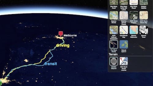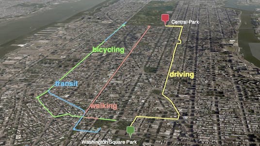 Wayfinder3D, developed by Will Geary, is an application for comparing suggested routes and estimated travel times by mode (driving, transit, bicycling, walking) between two locations on a 3D globe. Wayfinder3D fetches directions and travel times from the Google Maps Directions API, converts them into CZML (Cesium’s JSON format for describing a time-dynamic graphical scene), and visualizes them in the browser using Cesium’s 3D globe engine.