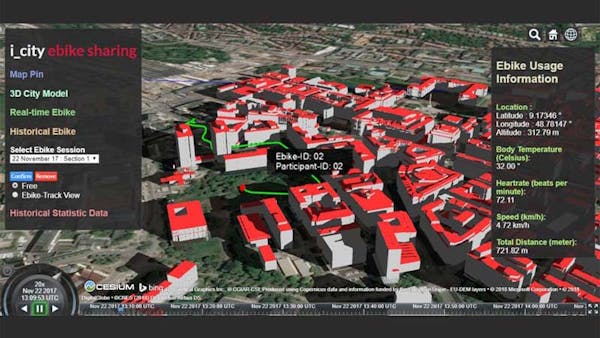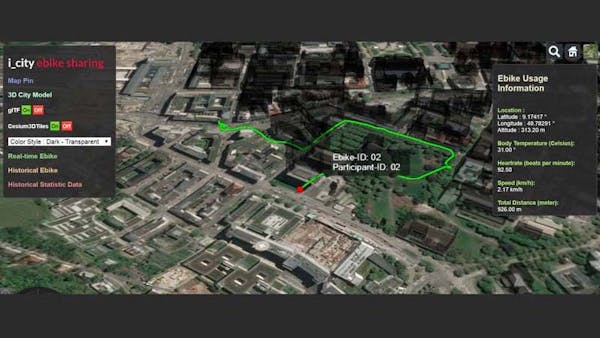 By converting the sensor data to CZML format, Santhanavanich was able to simulate the 3D path of historical E-bike routes in Cesium with a path visualization over time. To help users understand the area better, bike routes are set in a 3D city model, which is integrated with points of interest such as bike stations and bus stations.