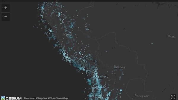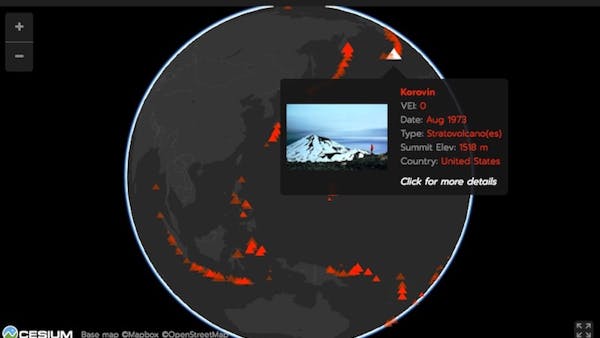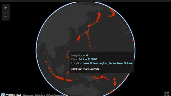 A precursor to E3 was on display in the Smithsonian’s Geology, Gems, and Minerals Hall. In an effort to make the application more widely available, Axis Maps developed E3 using Cesium for both 2D and 3D views. With Cesium, they were able to efficiently render and animate millions of data points in an interactive map. Each point is interactive: users can learn more about the event or visit external pages with even more information.