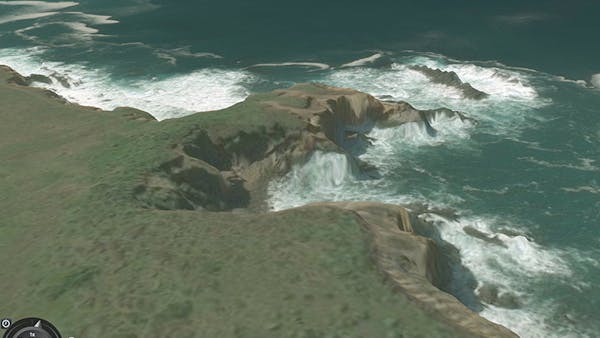 This coastal shot shows the old terrain (right); the rugged nature of the coast becomes clear with new high resolution terrain (left).