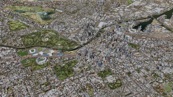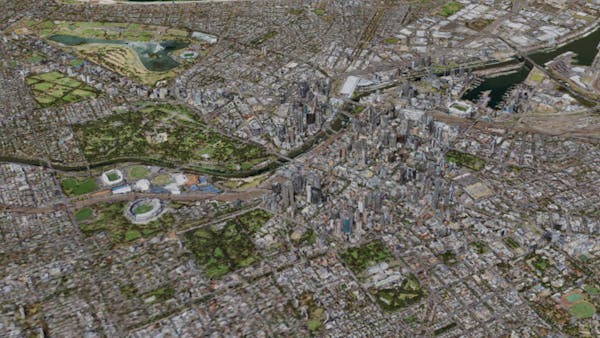 The updated photogrammetry tiling pipeline produces smoother, less distorted placeholders without significantly increasing tile size, which improves visual quality when loading views over constrained network connections. This is especially apparent with wide views of large-area, high-detail datasets like this 10-centimeter model of Melbourne, Australia, captured by Aerometrex: