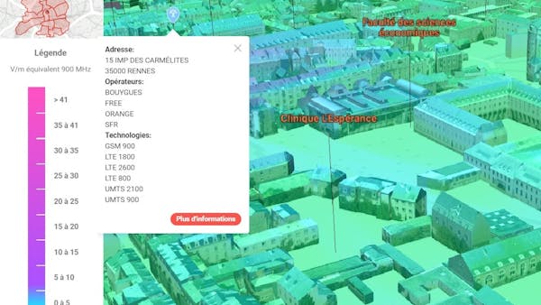 In this use case, Siradel simulated the impact of urban infrastructure for Rennes, France. Using the Smart City Explorer platform, Siradel examined the electromagnetic fields (EMF) related to mobile networks and mapped EMF exposure levels throughout the territory on a globe built with Cesium.
