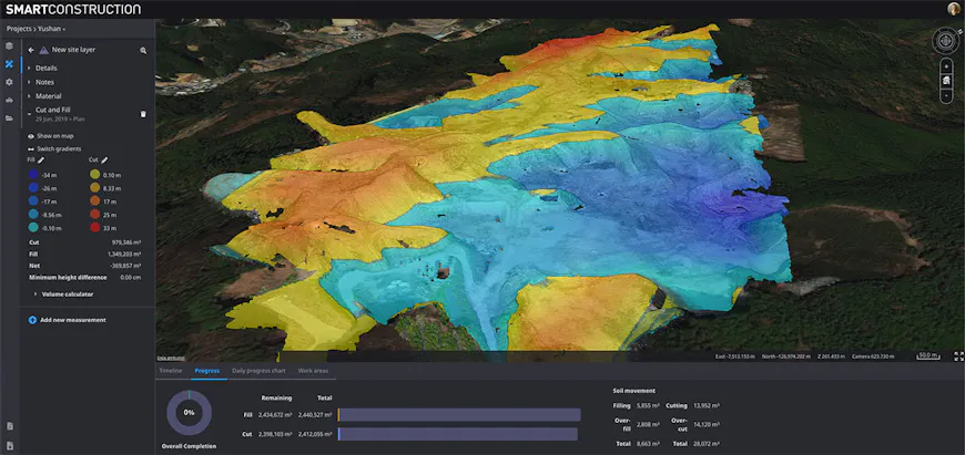 The Komatsu Smart Construction application includes tools to analyze progress. Here a drone survey shows a cut & fill heatmap with overall progress meter on the bottom.