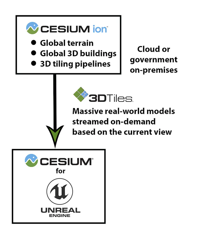 Cesium for Unreal will have a default connection to the Cesium ion SaaS platform for ready-to-use 3D Tiles of terrain and 3D buildings, and best in class content pipelines for generating efficient 3D Tiles from source data such as terrain, imagery, and photogrammetry models. Cesium for Unreal will also be able to stream 3D Tiles over on-premises private networks with Cesium ion.