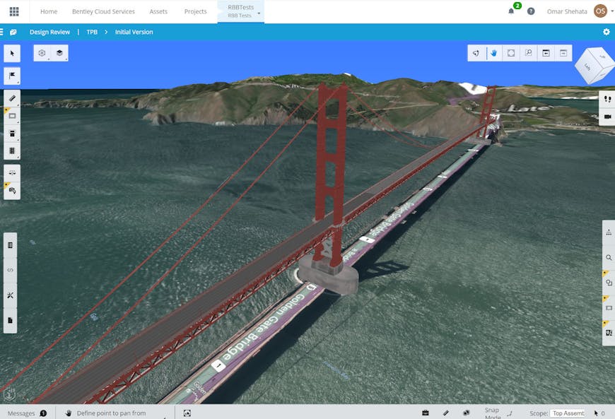 The Golden Gate Bridge, tiled into 3D Tiles by Cesium ion and visualized in iModel.js, the open source visualization component of iTwin.