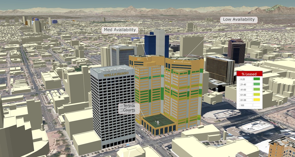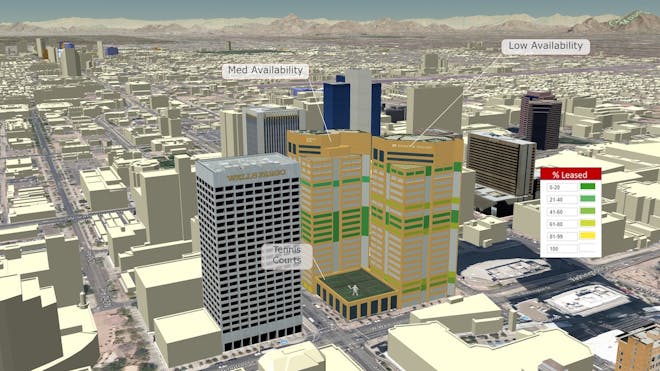 In the realistic 3D geospatial context, display property availability, price, and other factors that support decision-making.